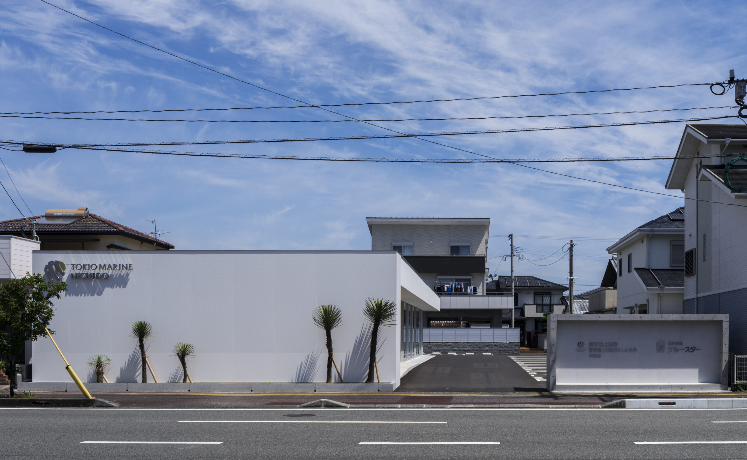 南のメイン道路側の間口はさほど広くなく、道路側に対して開かれたファサードとすることが難しかった為、道路側は白の1200*3000の大判タイルの白い壁面とサインのみで構成して、閉じられた印象ではあるが、明るく清潔感あるファサードとした。