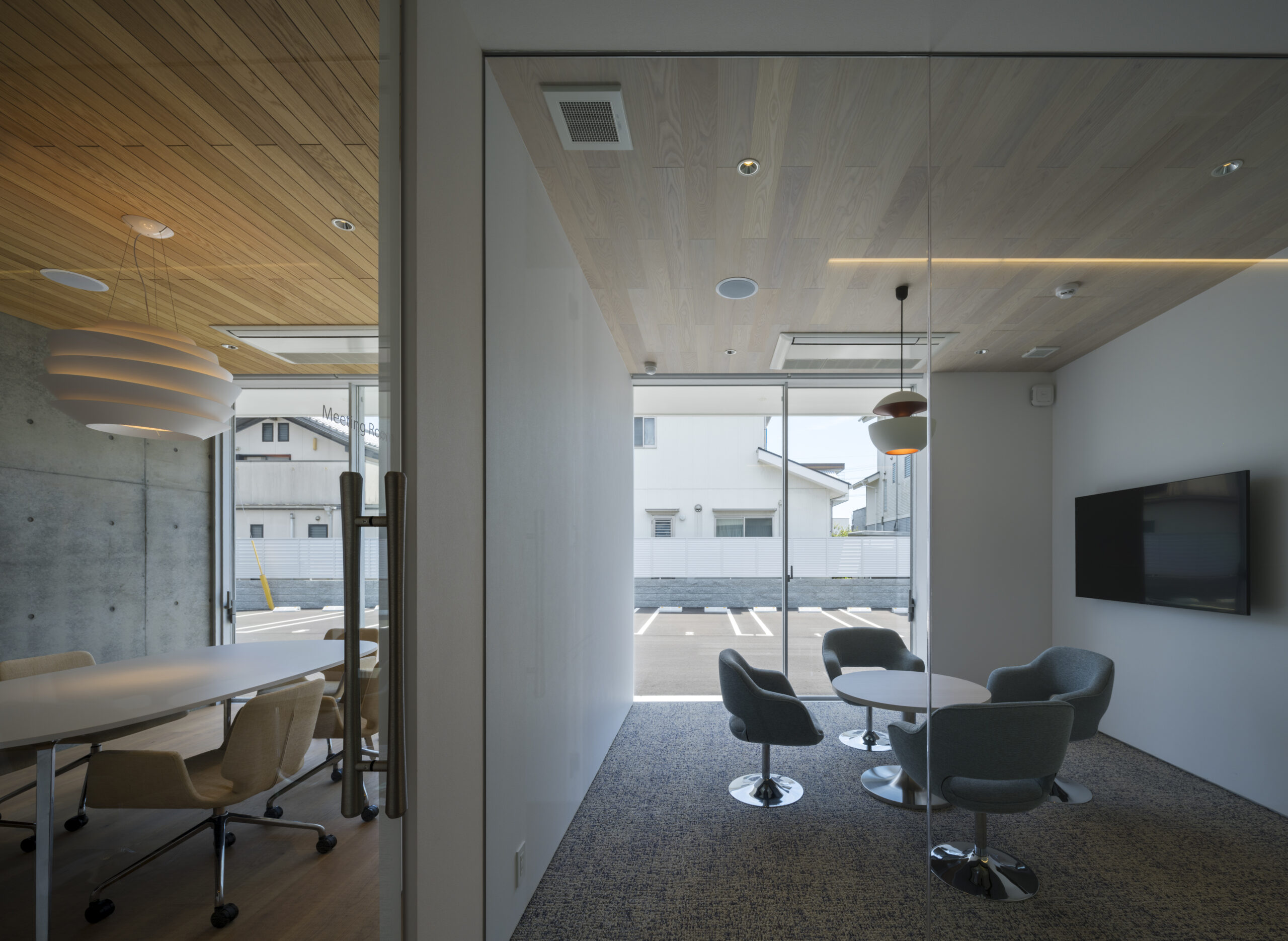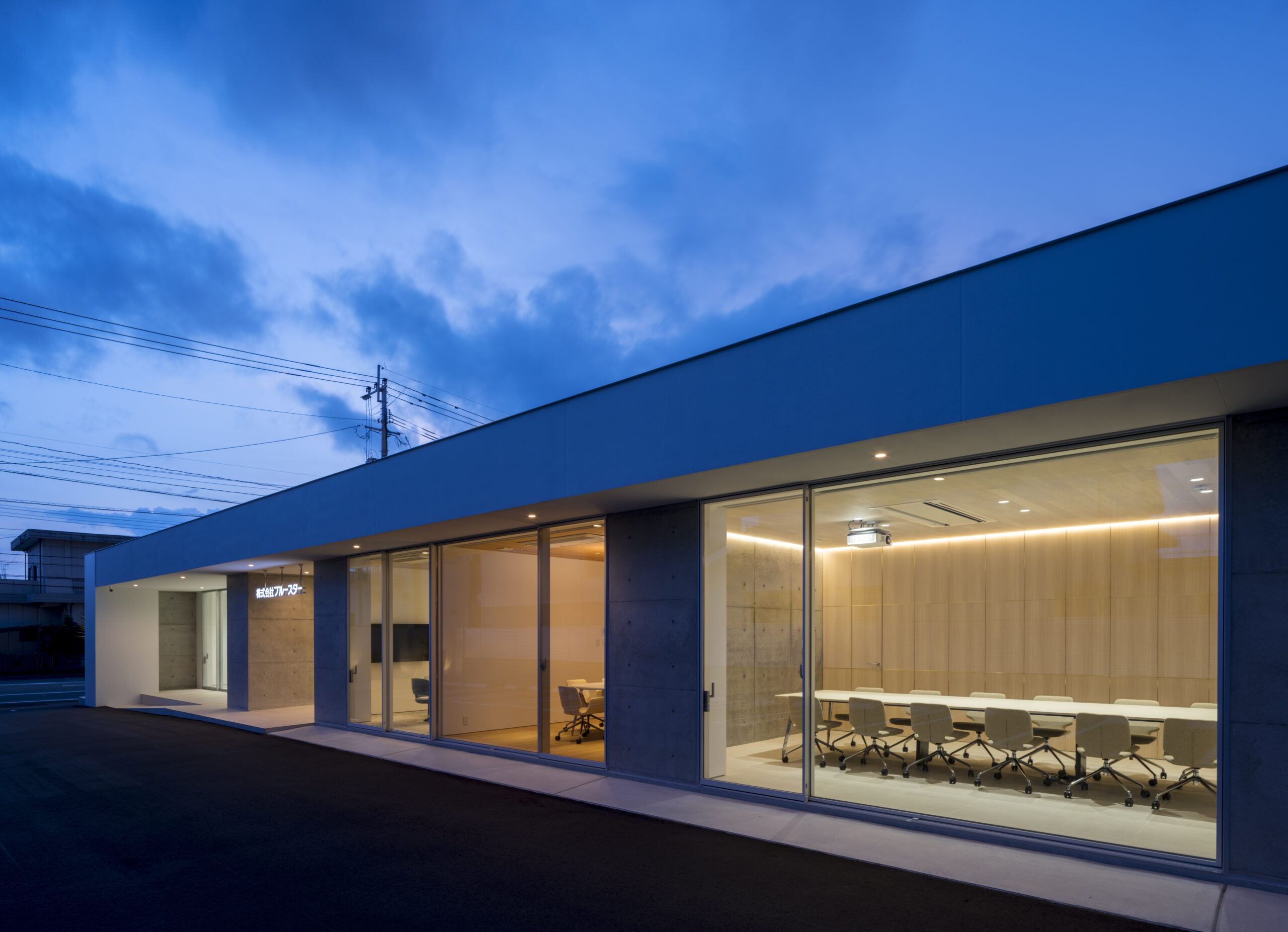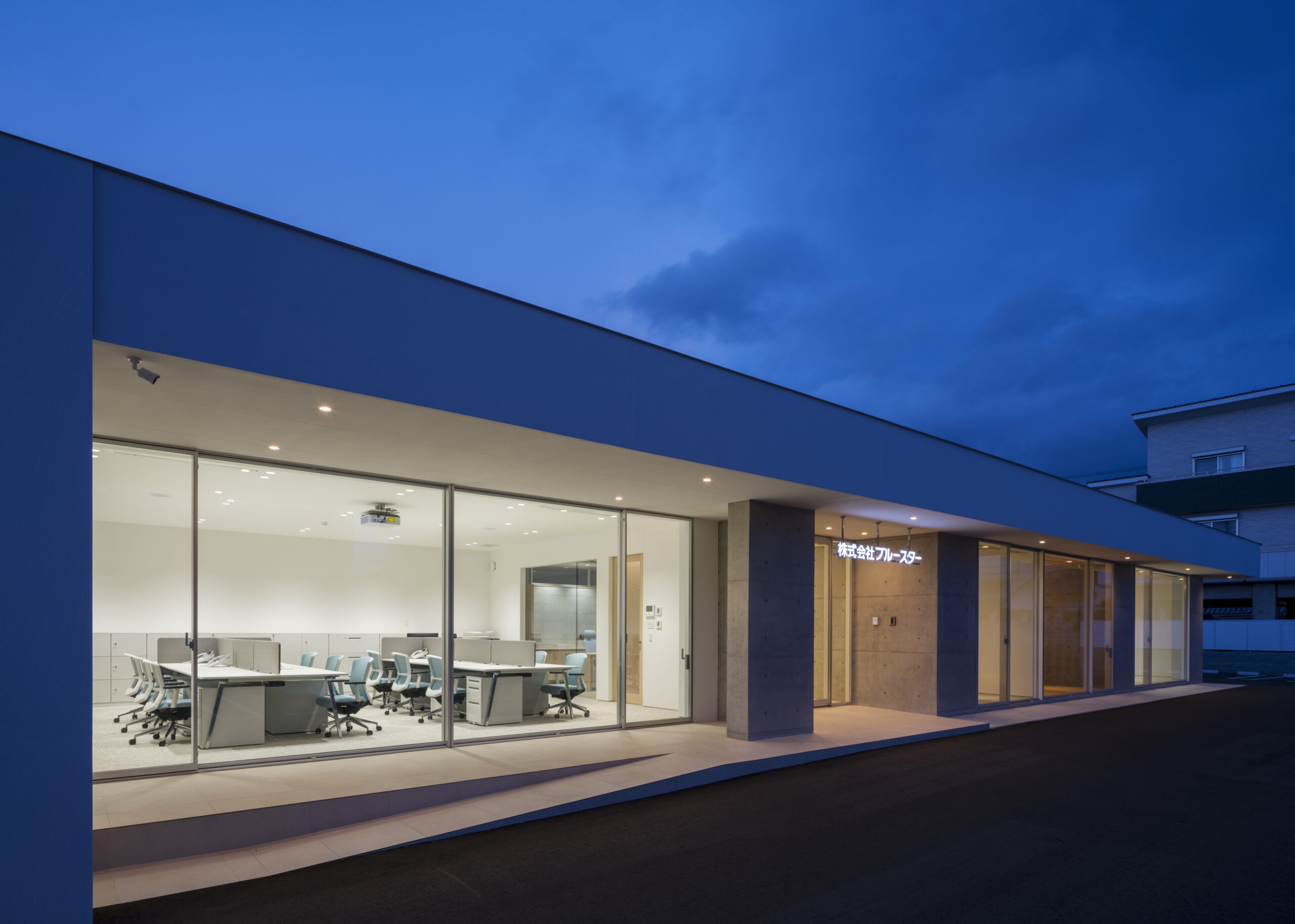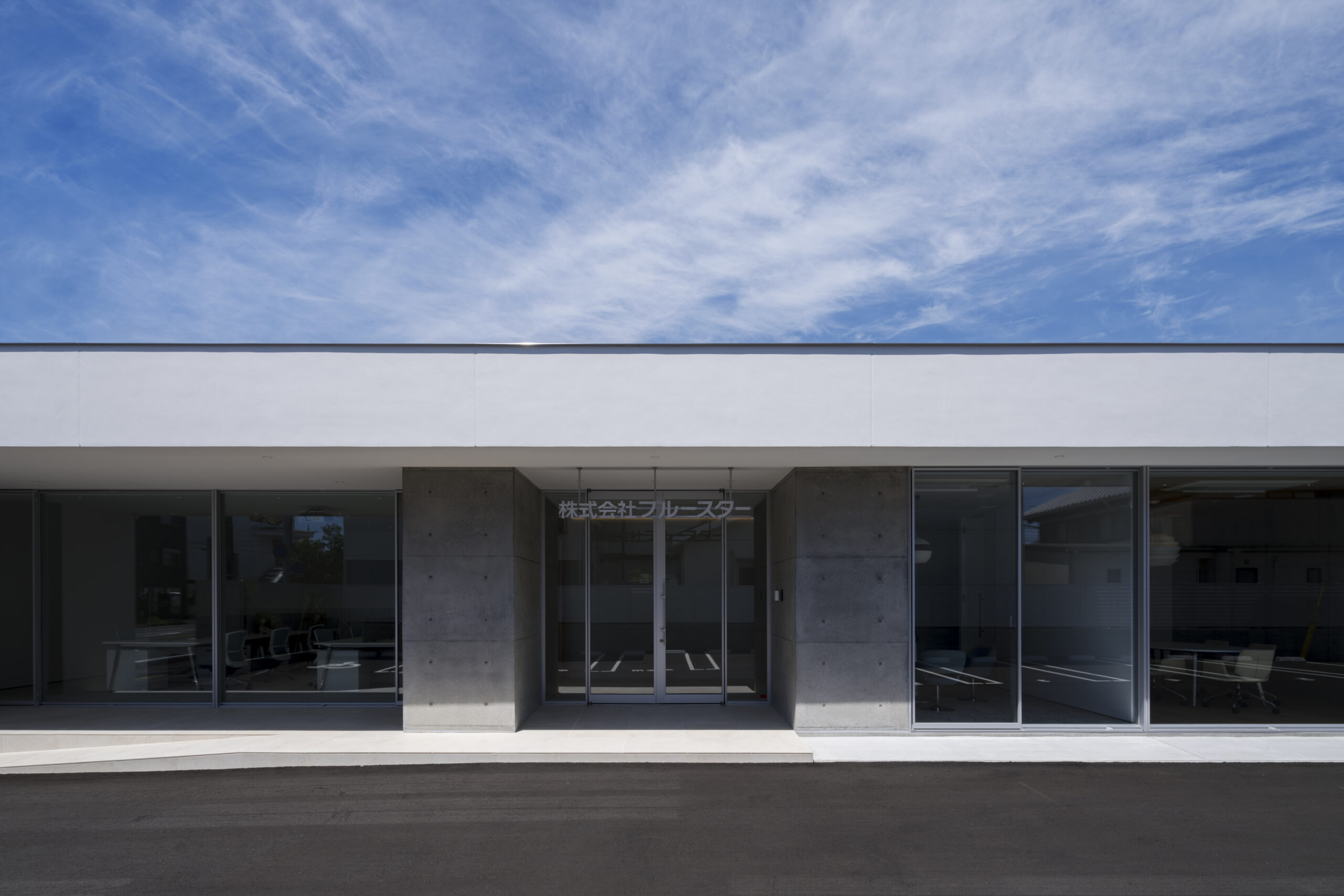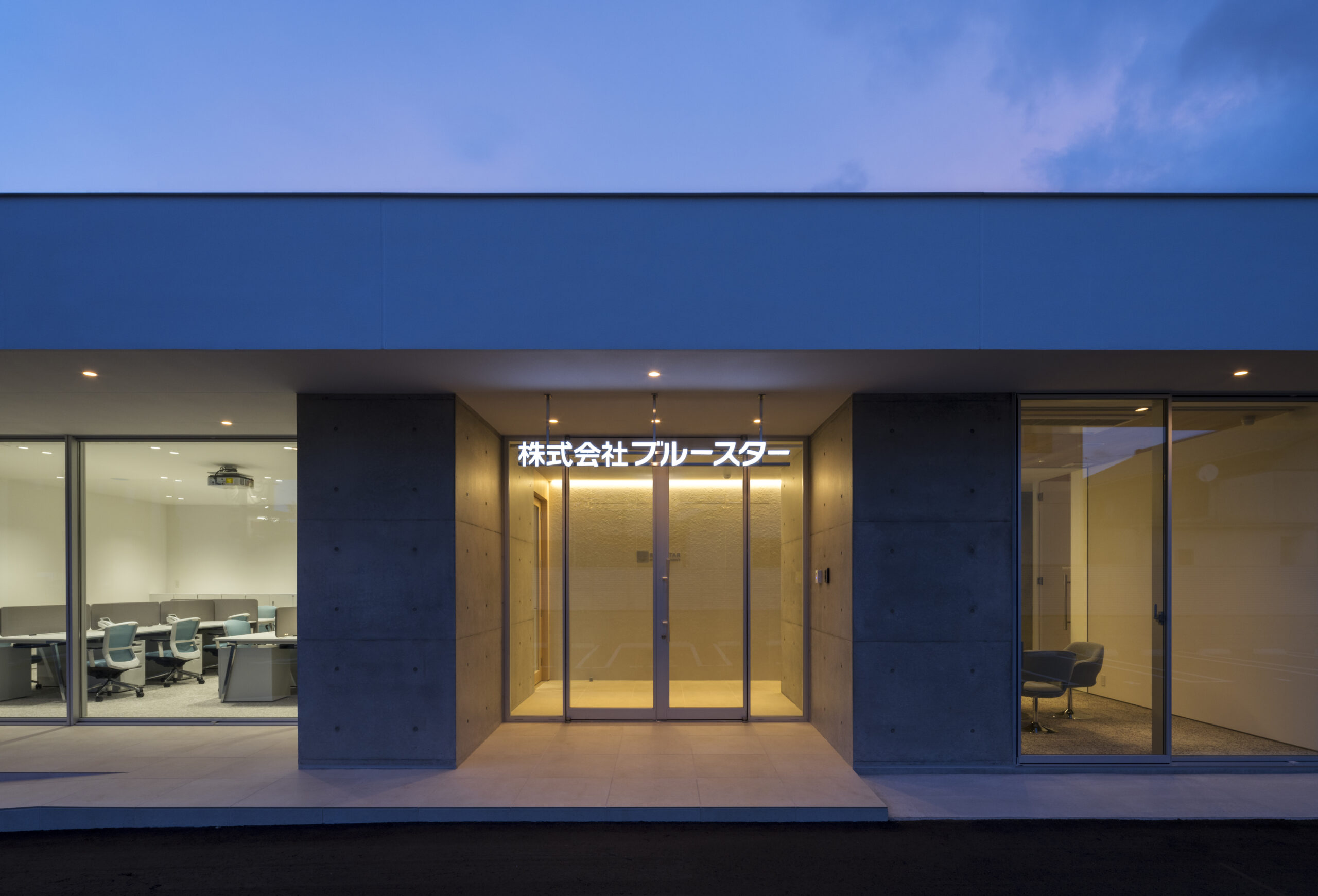 道路から敷地へ入ると一変し、執務室からミーティングルームまで開口部は全て大判ガラスで、内部の様子をはっきりと見通すことができる、透明感あるファサードとなっている。