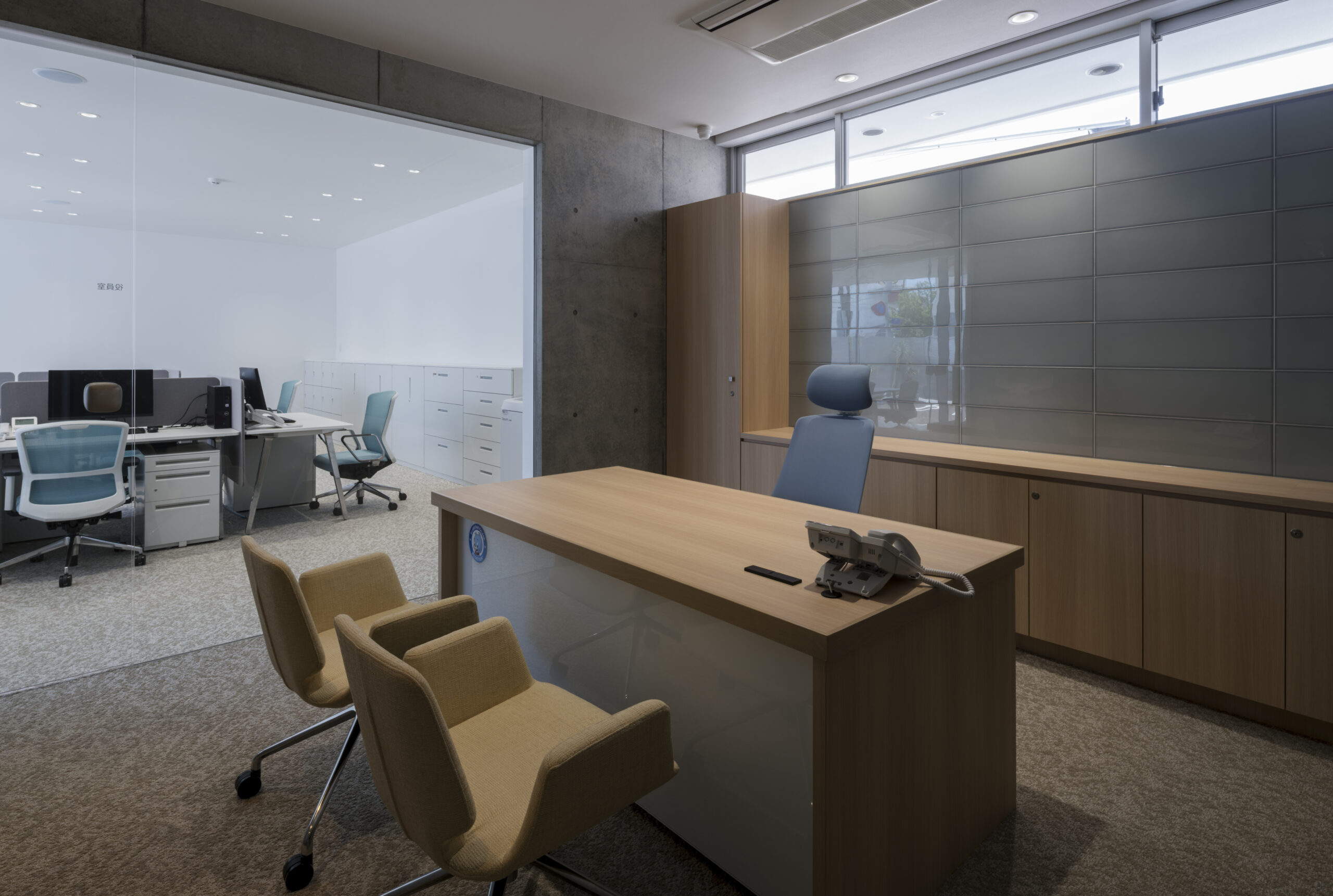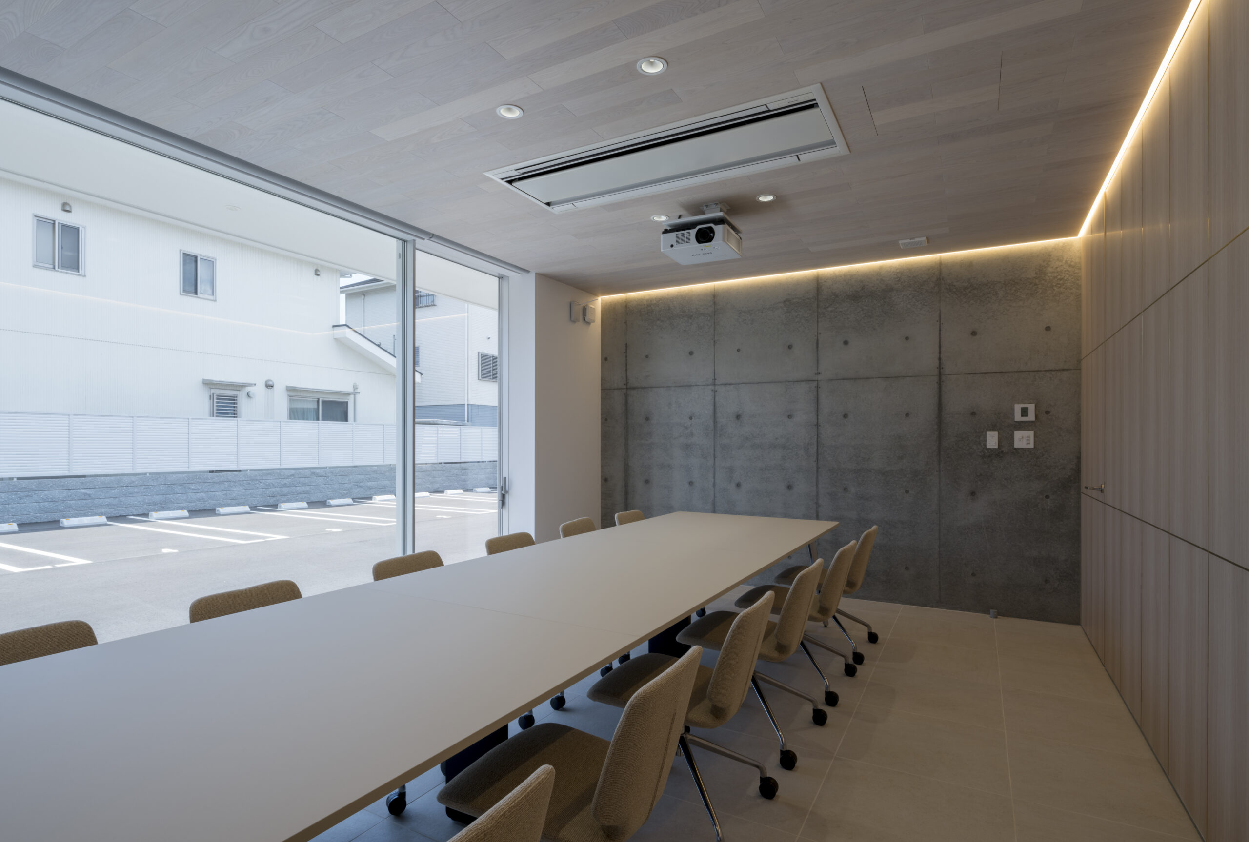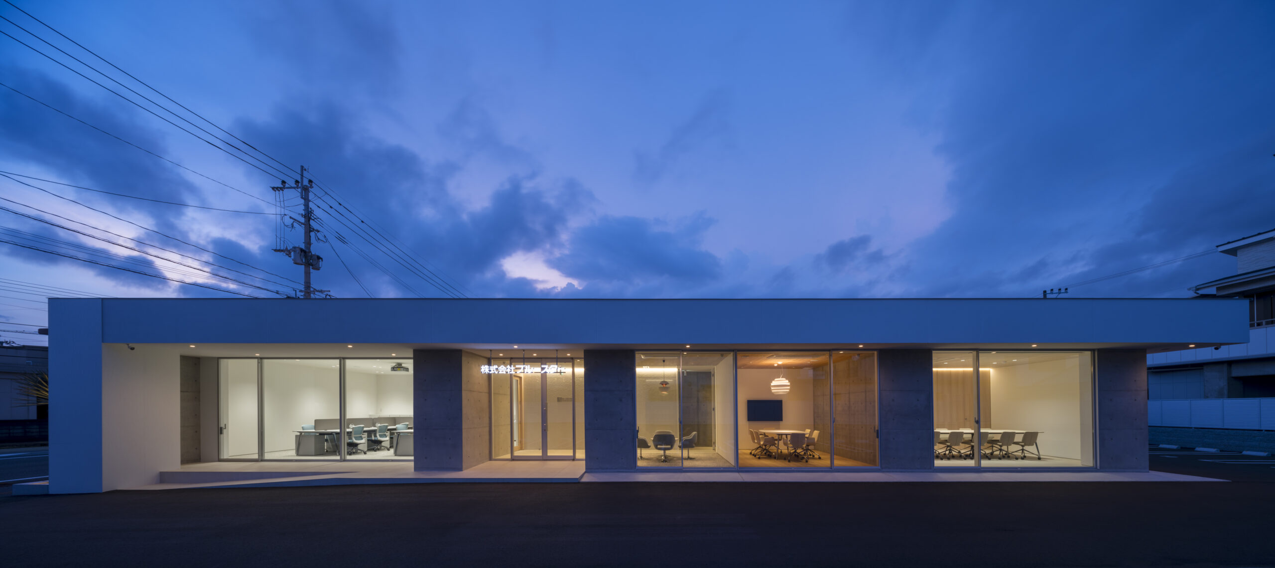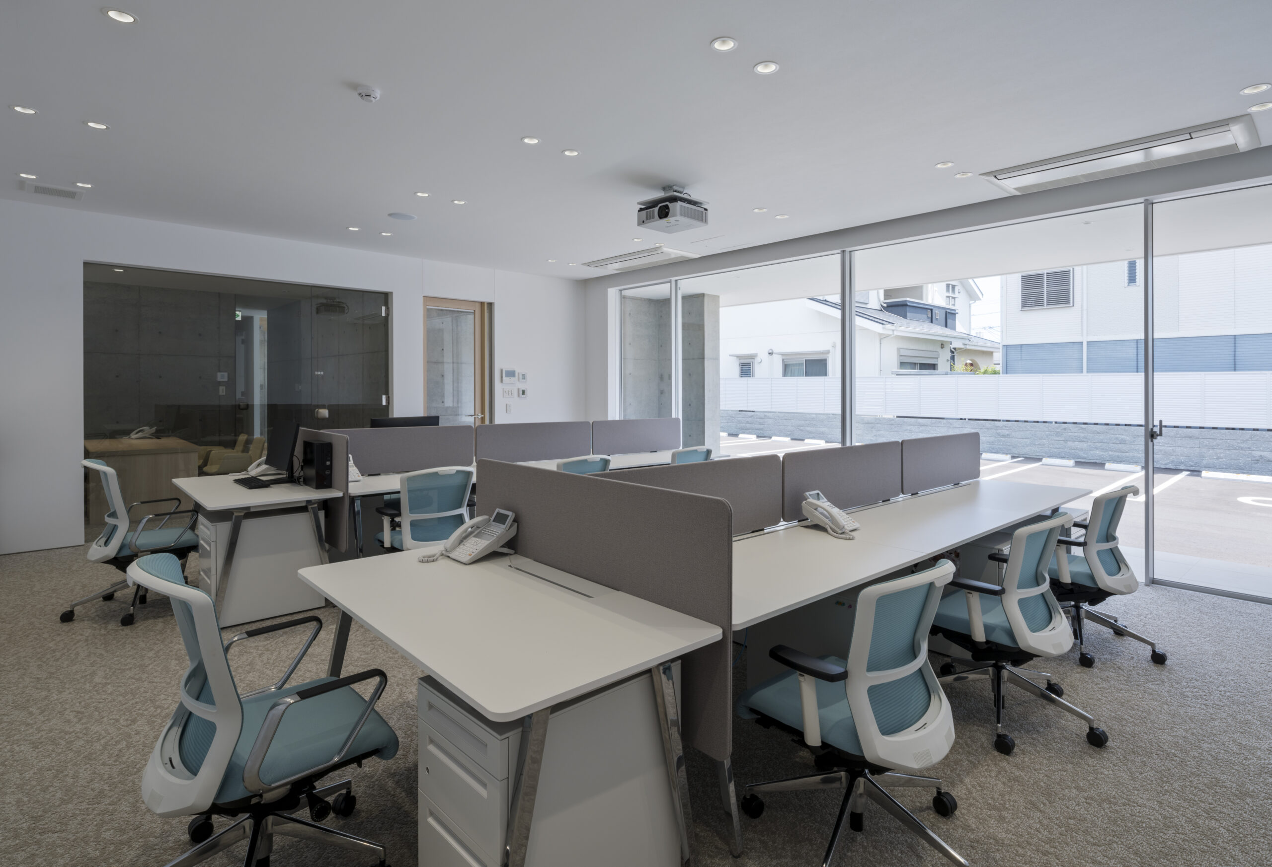 道路から敷地へ入ると一変し、執務室からミーティングルームまで開口部は全て大判ガラスで、内部の様子をはっきりと見通すことができる、透明感あるファサードとなっている。