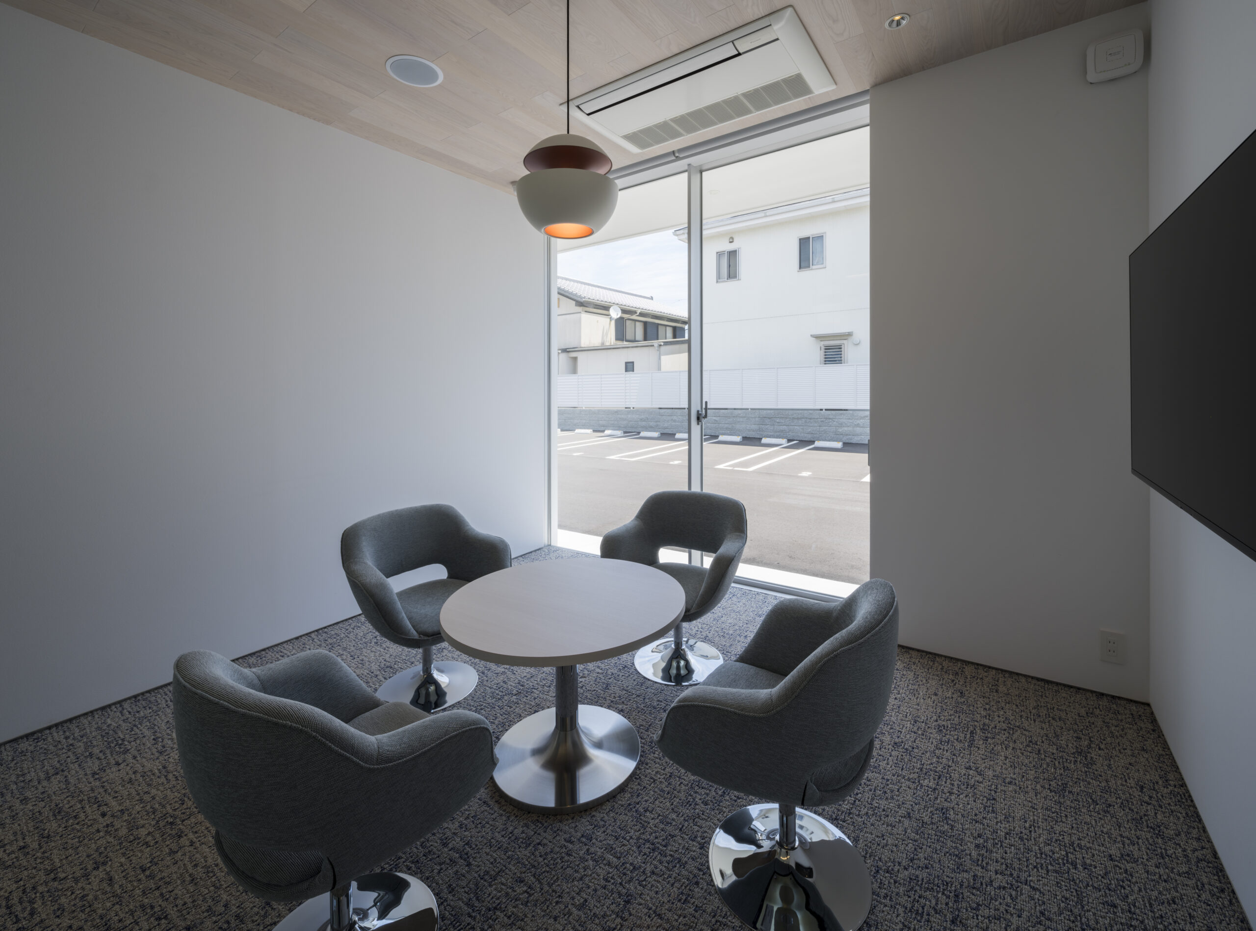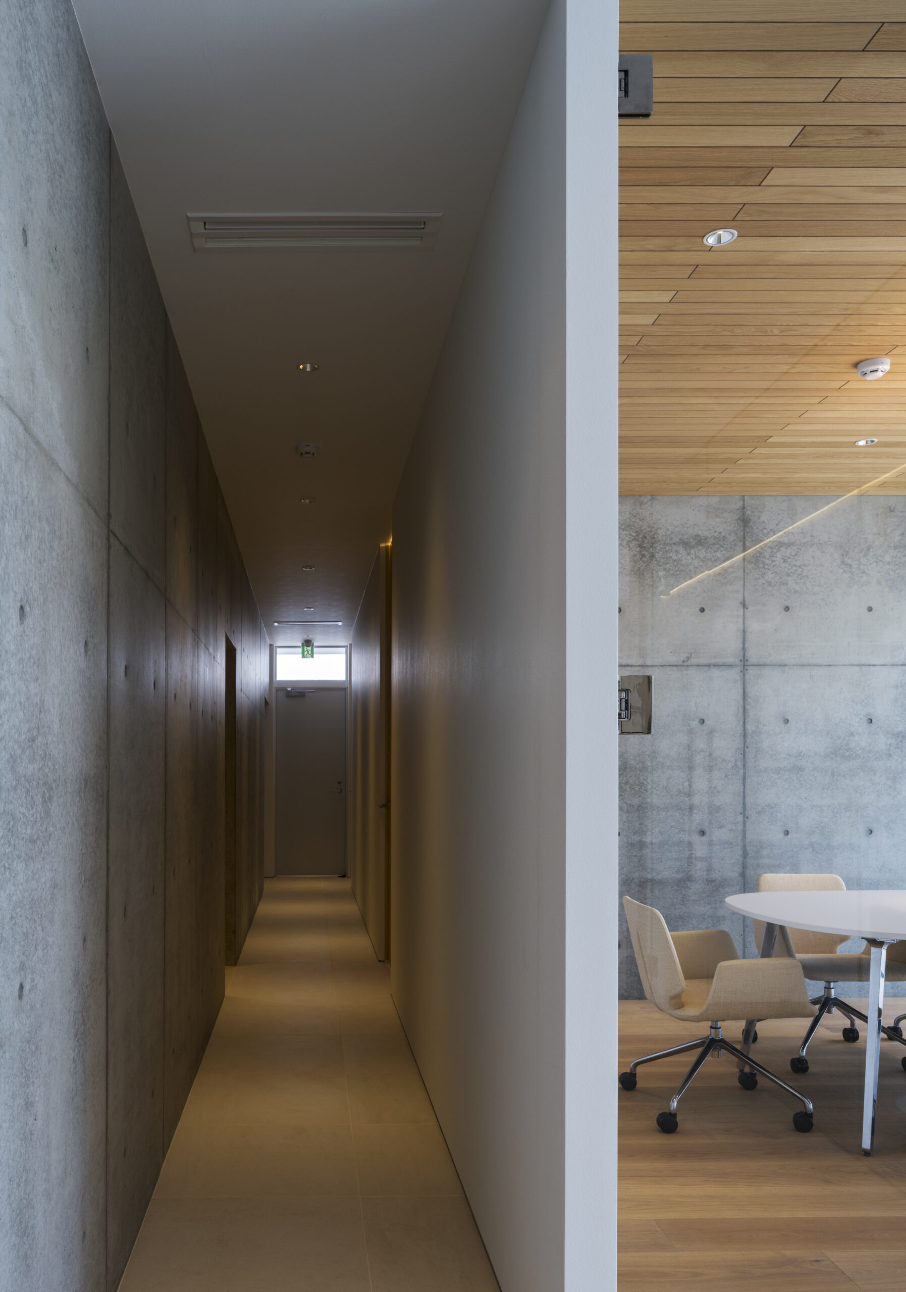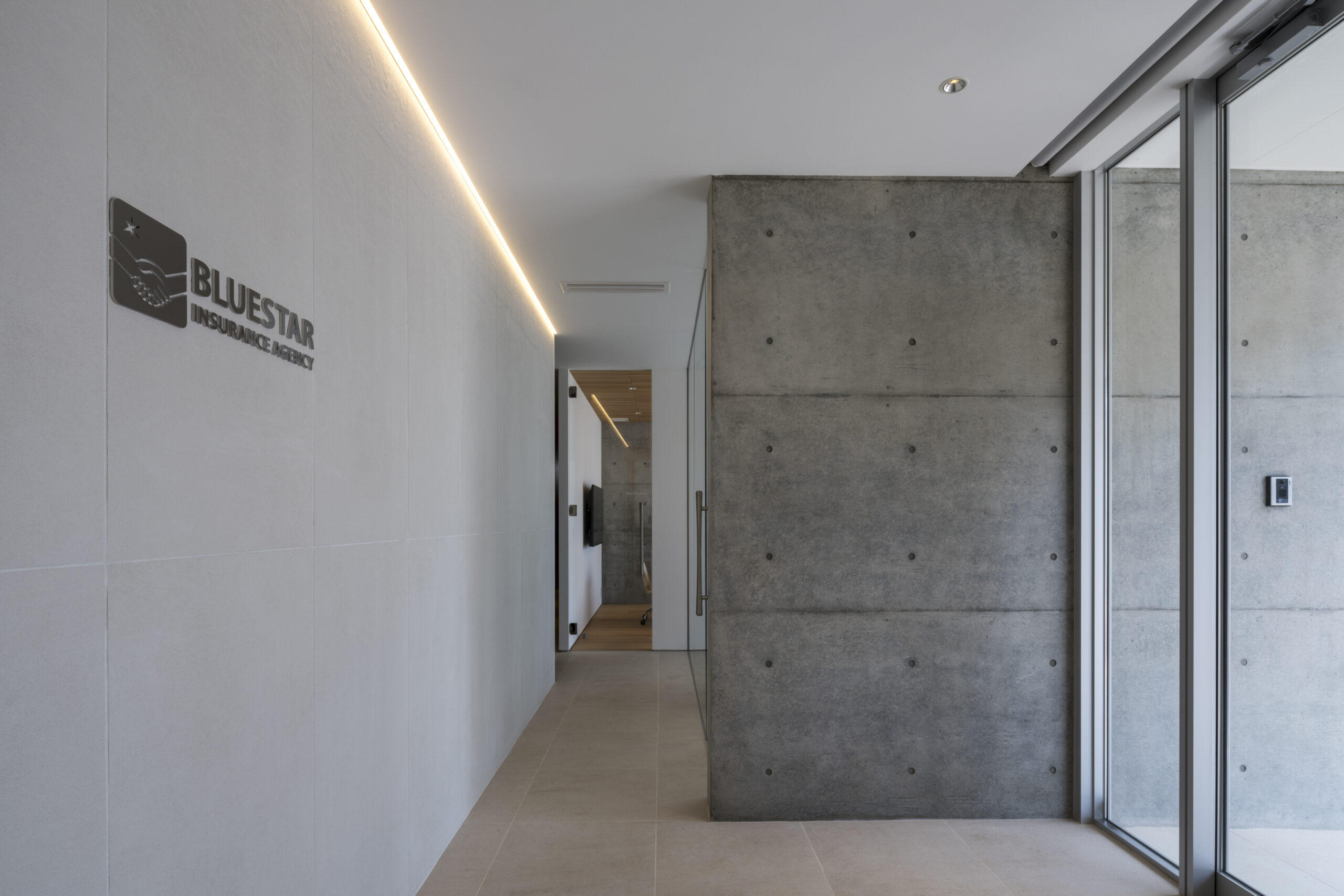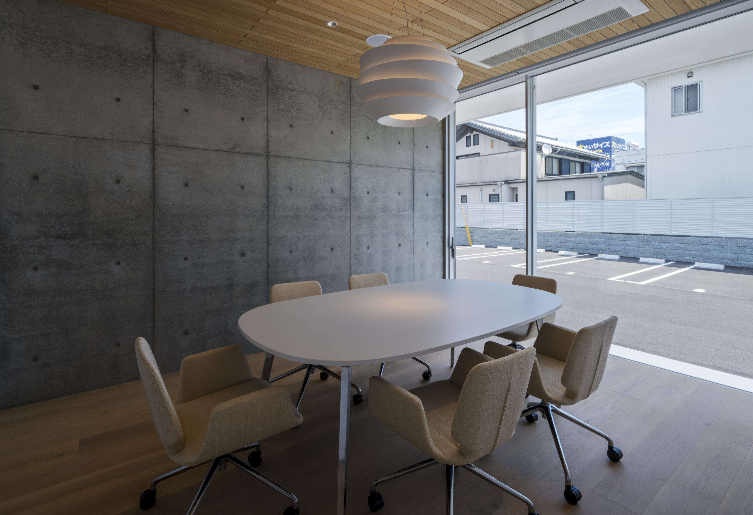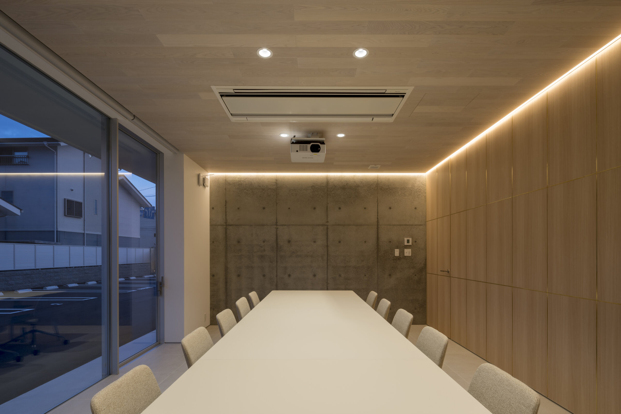 道路から敷地へ入ると一変し、執務室からミーティングルームまで開口部は全て大判ガラスで、内部の様子をはっきりと見通すことができる、透明感あるファサードとなっている。