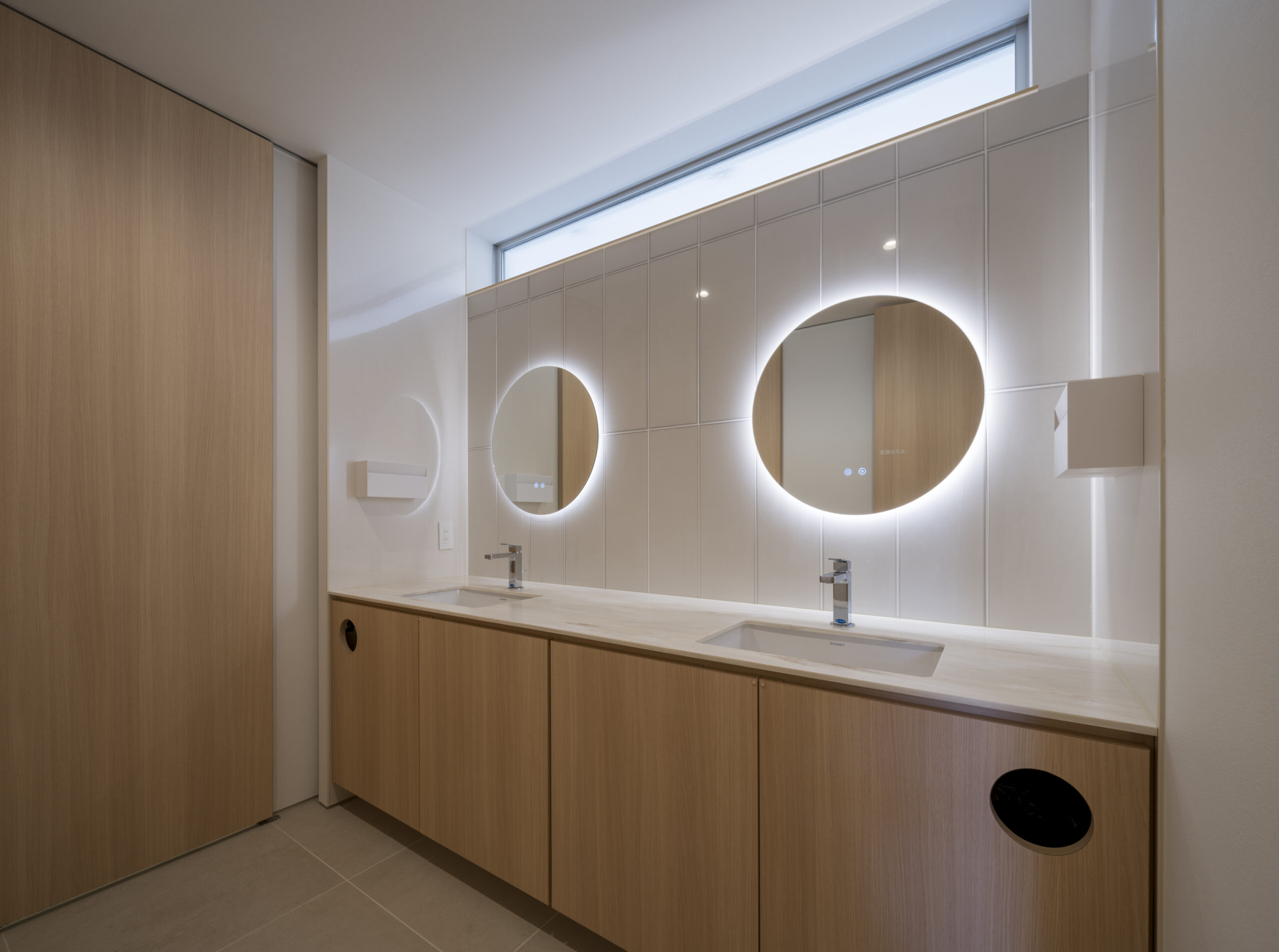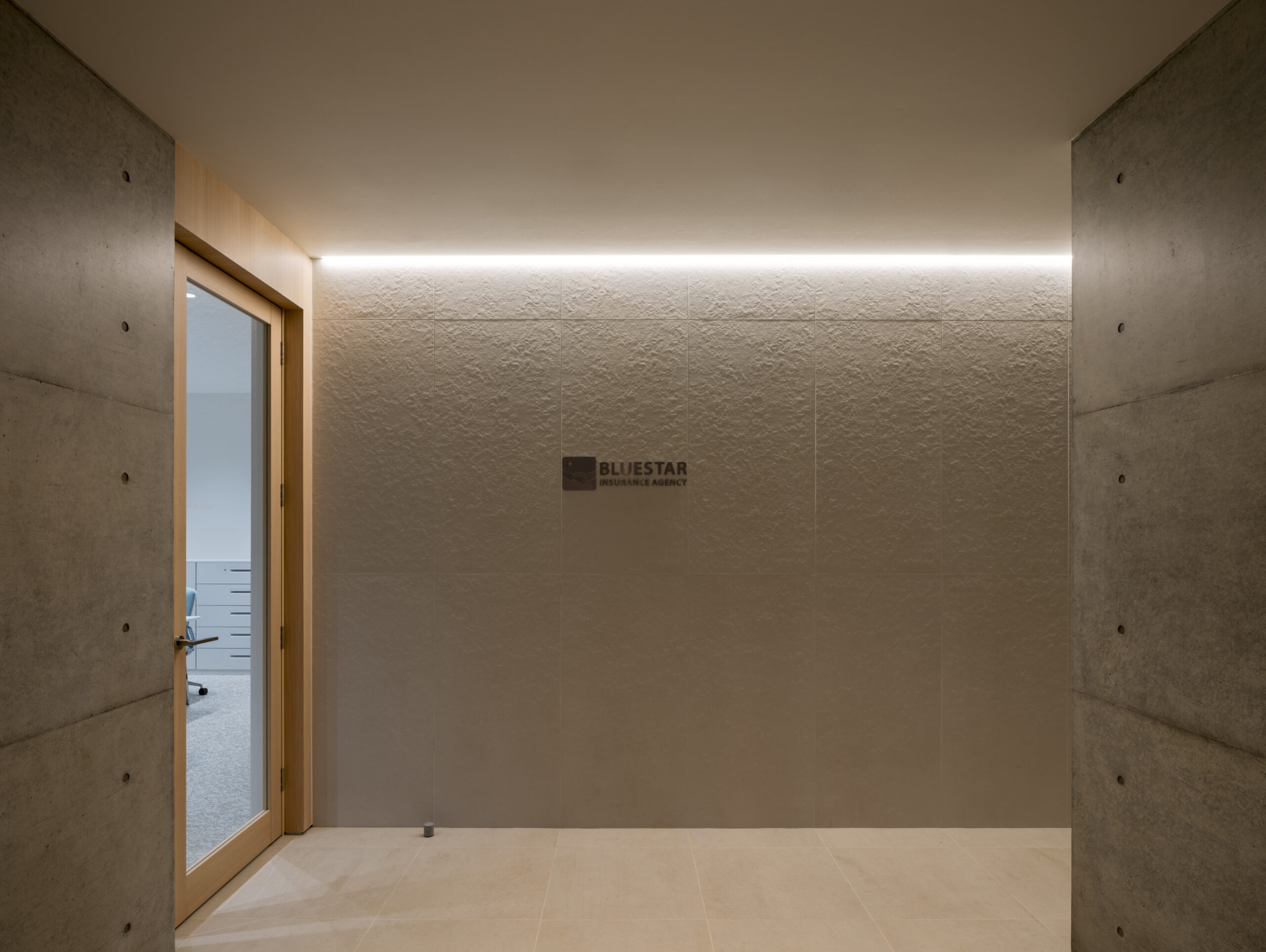 内部は白とベージュを基調とした明るい色調で構成され、床や壁タイル、什器などの一部に同社のコーポレートカラーである「ブルー」が配色されており、同社のアイデンティティの表出とさらなる共有がなされている。