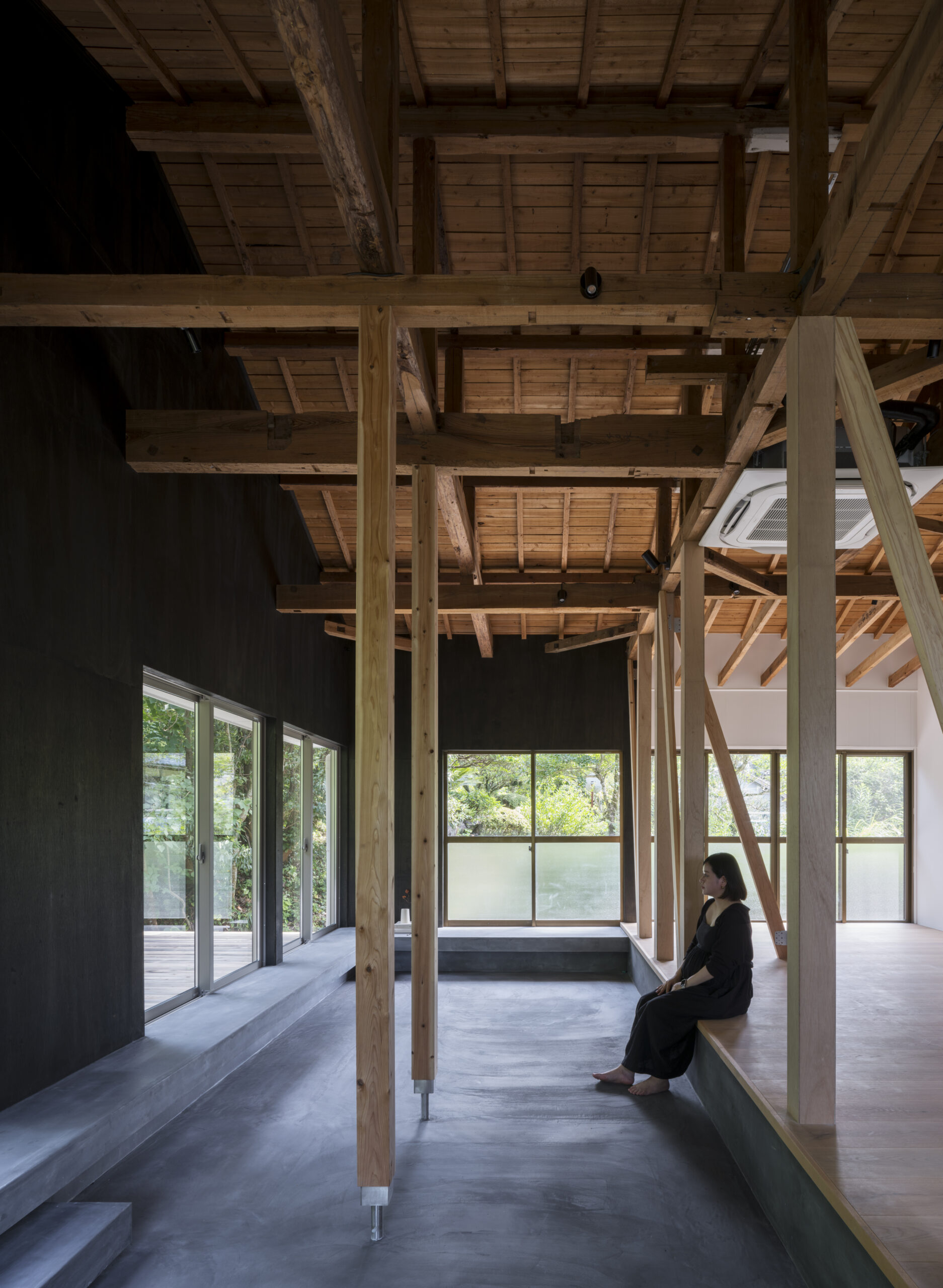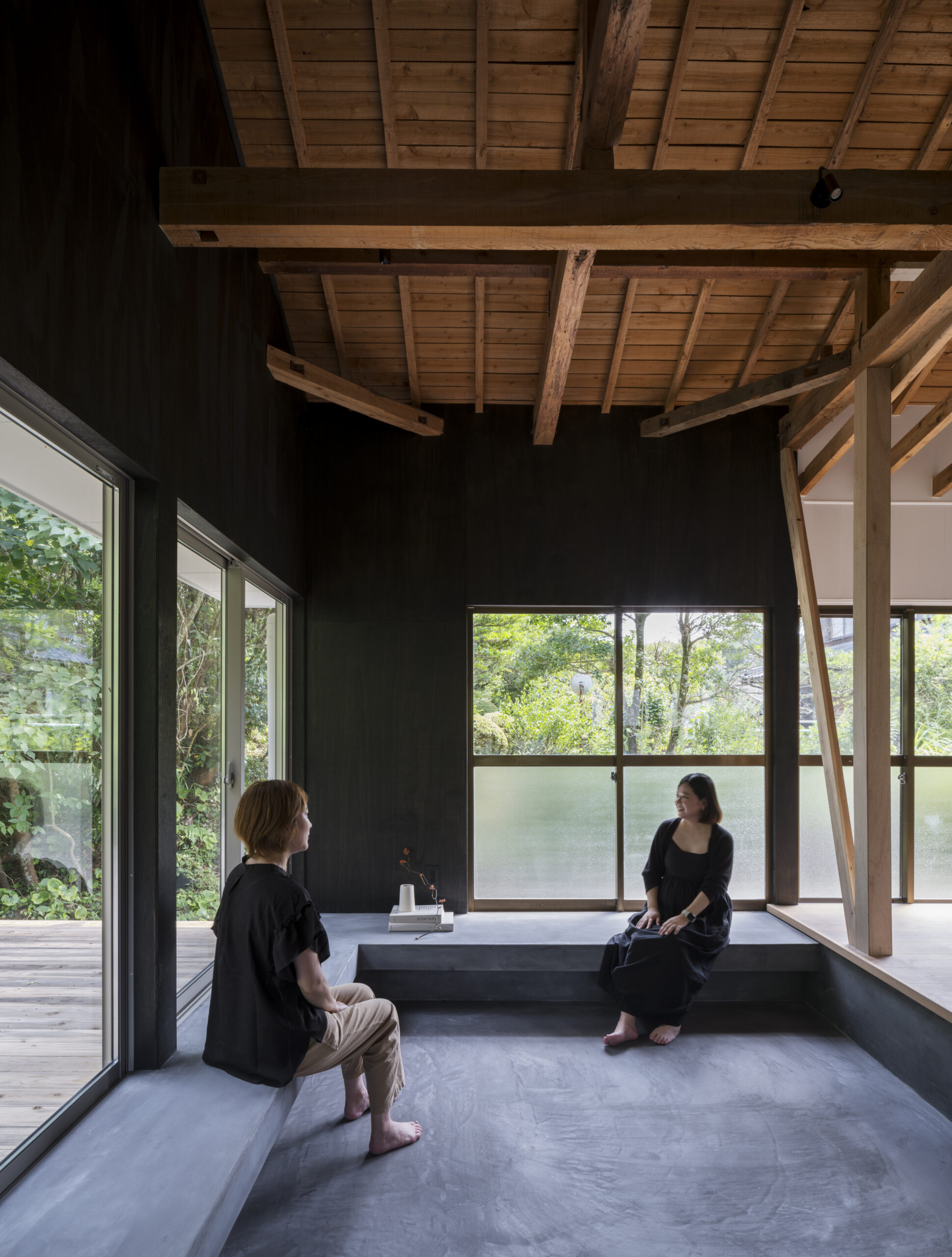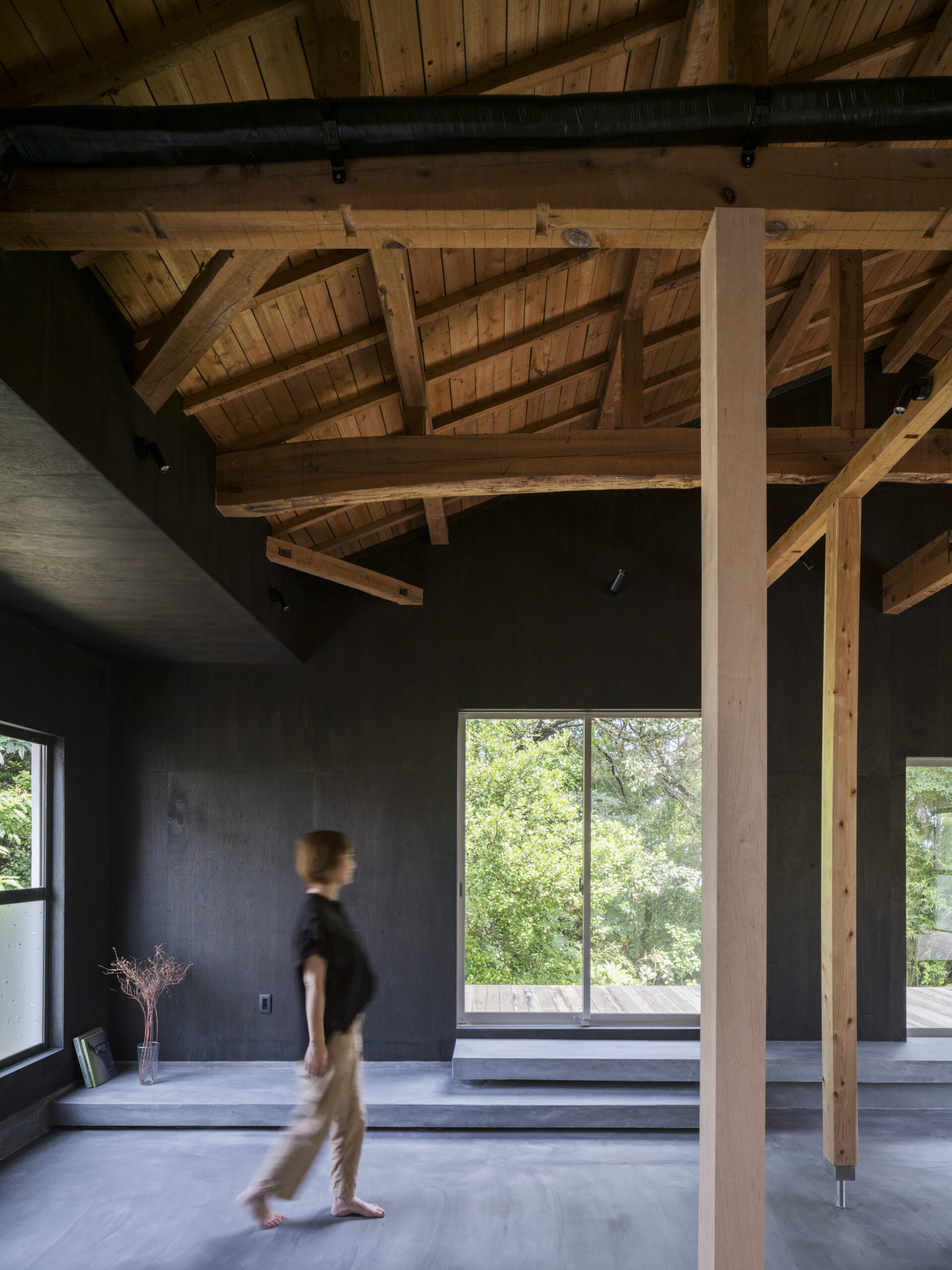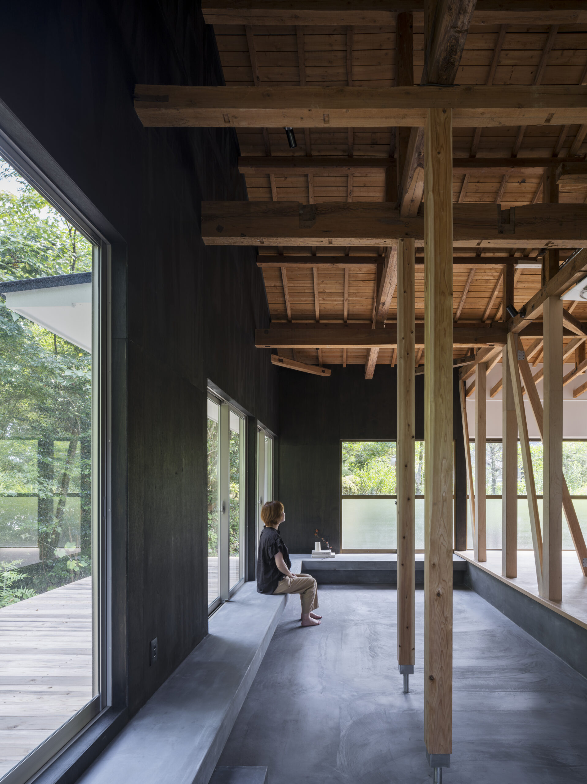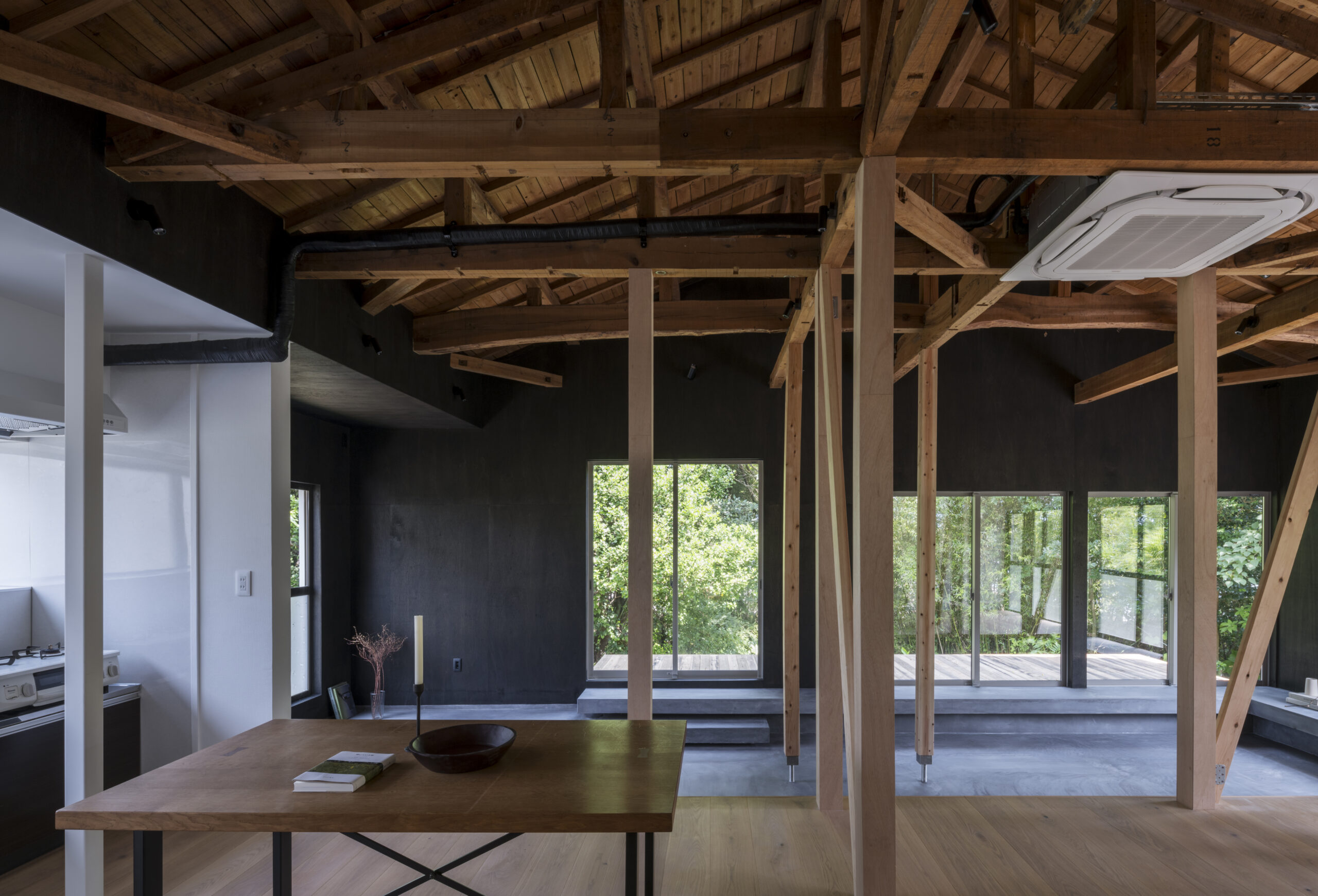 黒に染め上げることで雑木林の緑が際立つとともに室内へと侵食し傍に感じられ、空間が自然で満たされていく。