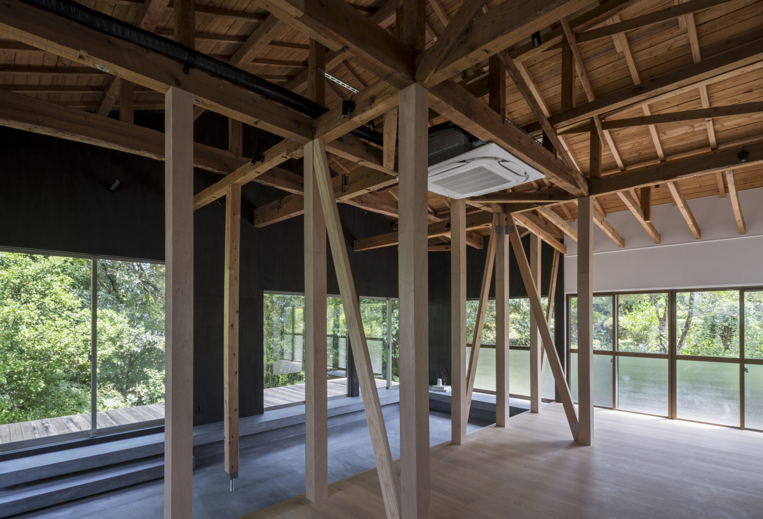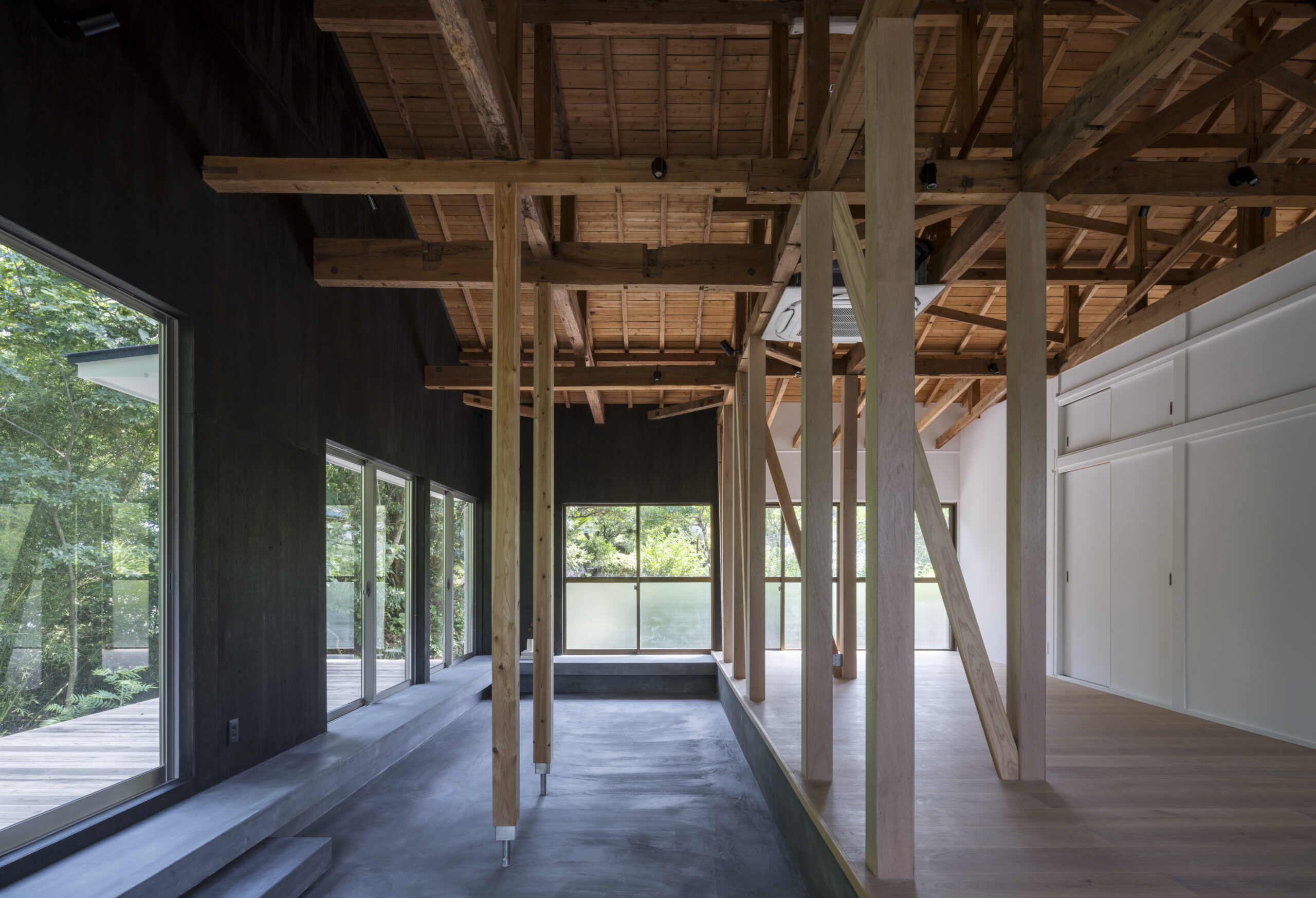 あらわにされた無造作に林立する柱は、雑木林の木々と呼応するかのようで、室内に雑木林の空気感を呼び込んでいる。