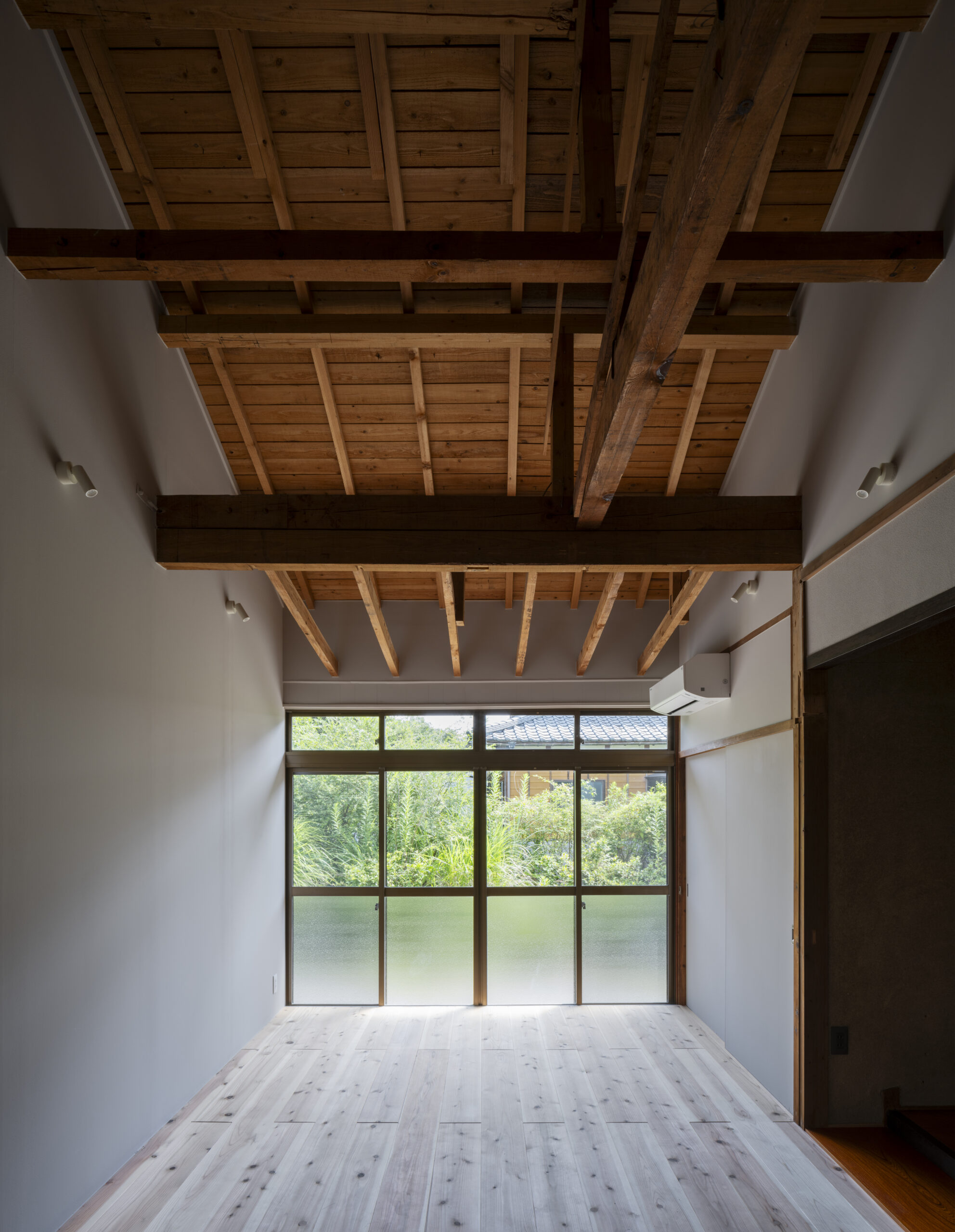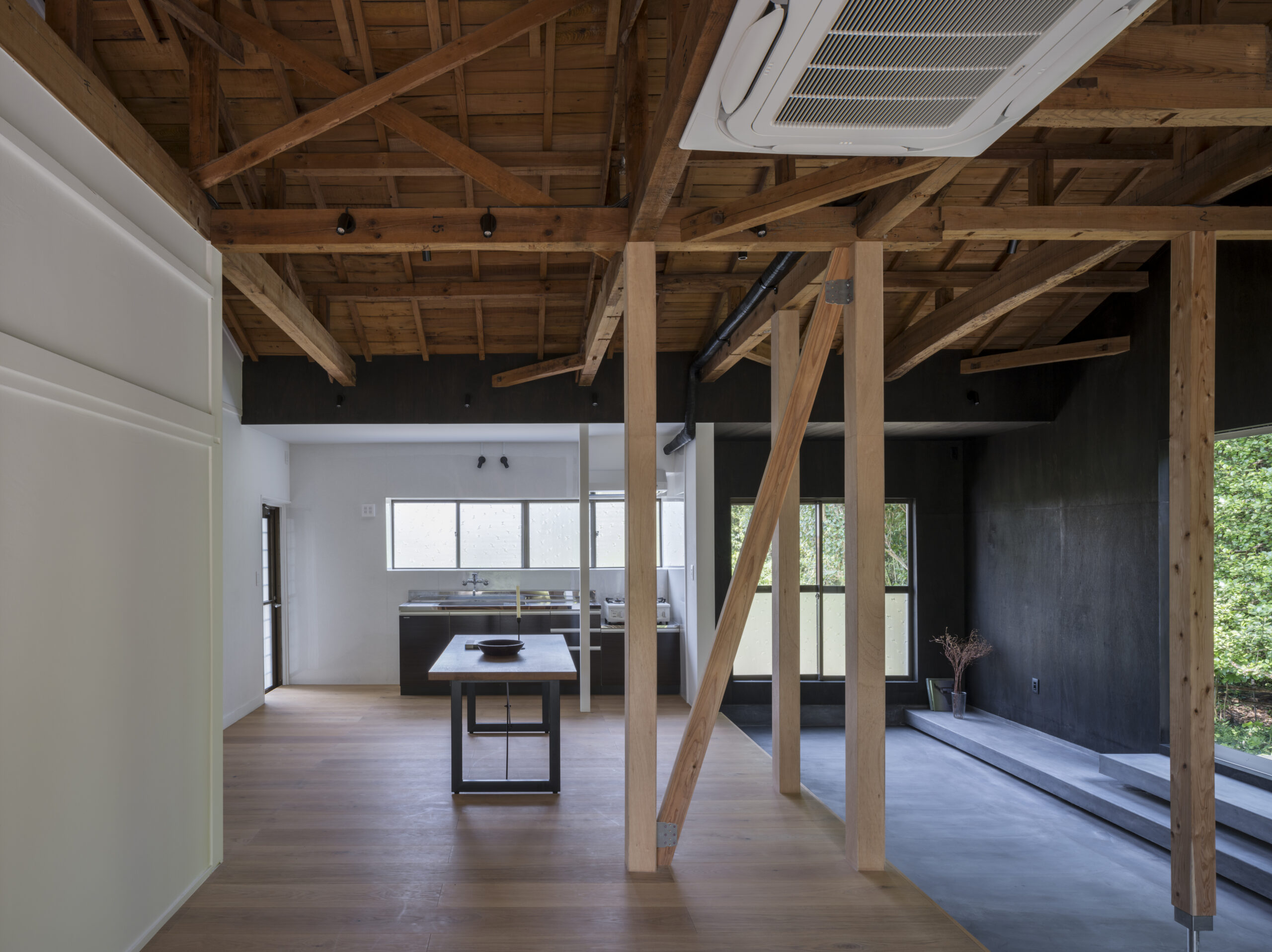 柱や筋交い、小屋組みはそのまま現しとした。